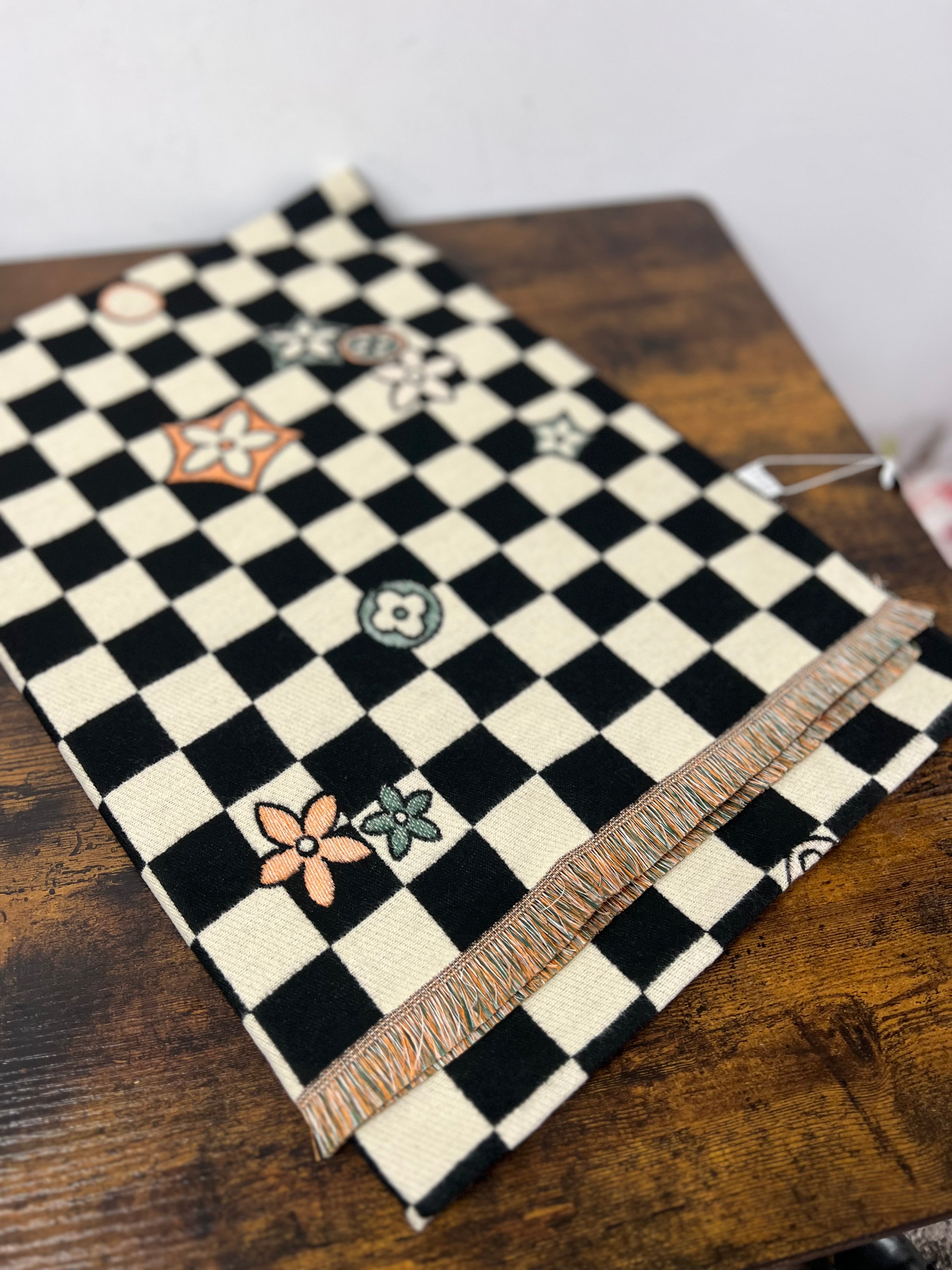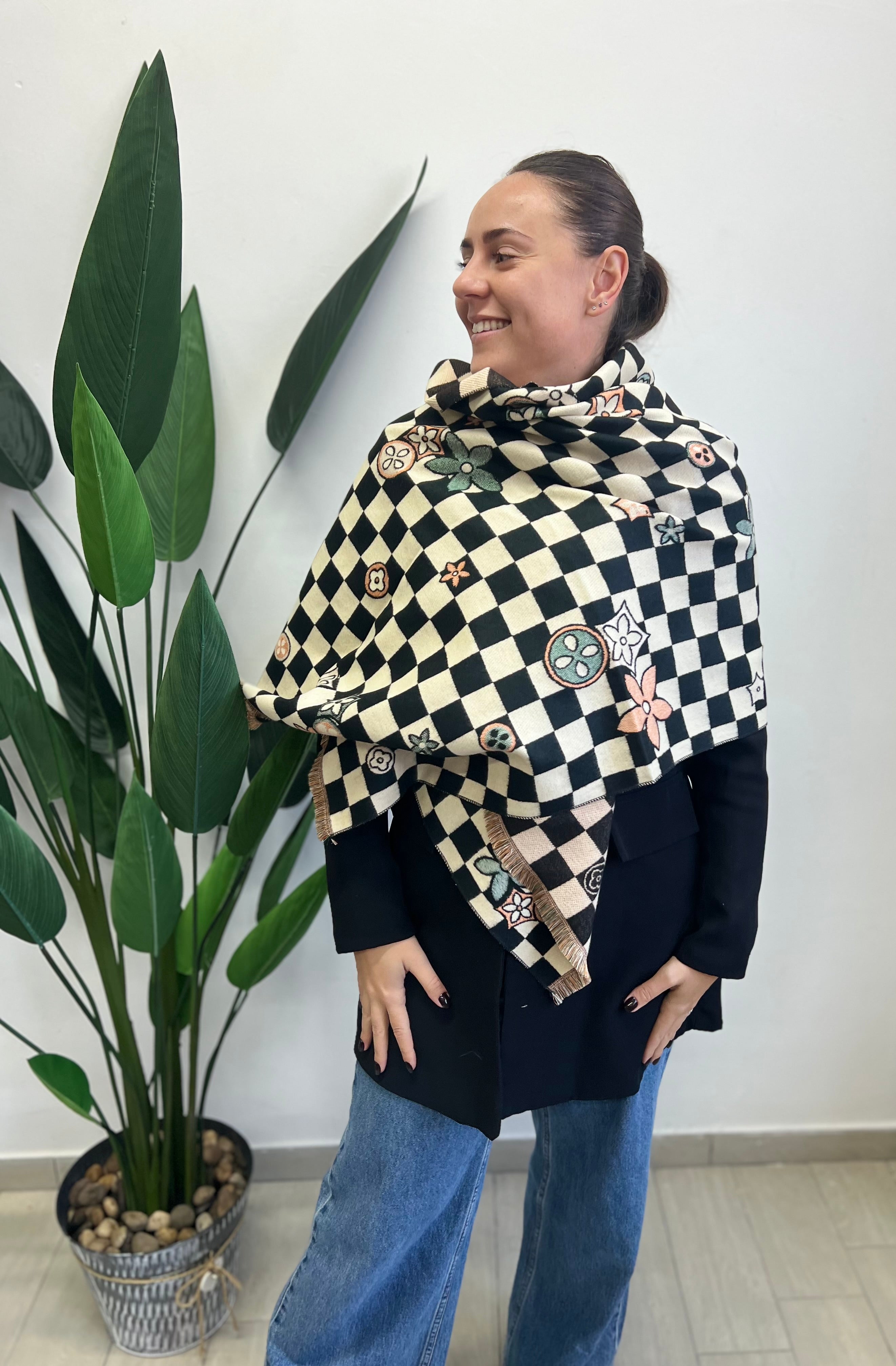 Sciarpona misto cachemire scacchi nero panna